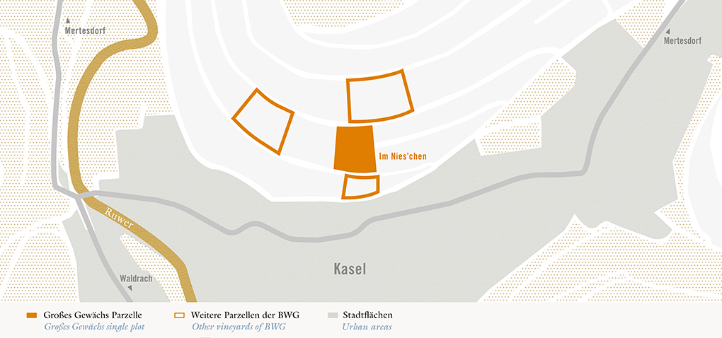 Die Parzelle „Im Nies’chen“ ist das absolute Filetstück dieser bemerkenswerten Lage, zentral im mittleren Gewann gelegen. Hier wachsen 50 Jahre alte Reben, die Trauben der Extraklasse hervorbringen. Diese jahrzehntealten Wurzeln fördern nicht nur die Tiefe, sondern auch die Harmonie der Weine. Der kühle Wind des Ruwertals sorgt für ein ausgewogenes Mikroklima, welches die Reifung der Trauben fördert und zugleich deren hohe Qualität bewahrt.
